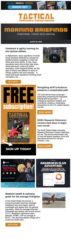 The e-newsletter is one of Tactical Training & Conditioning’s hottest digital platforms. Your high-visibility ad is placed prominently among must-read news items. Plus, it comes with exclusive detailed metric and engagement reports. Limited spaces available.
